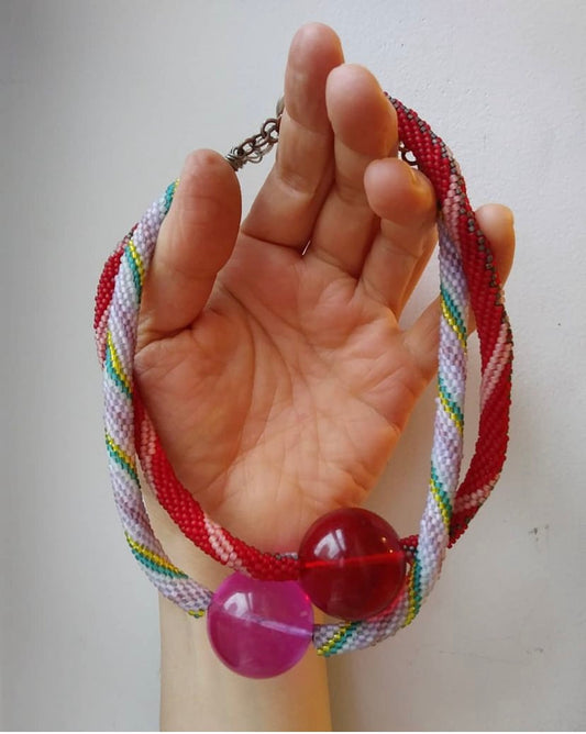 Glass Seed Beaded Necklace with Glass Red Ball by Daniela Mamon
