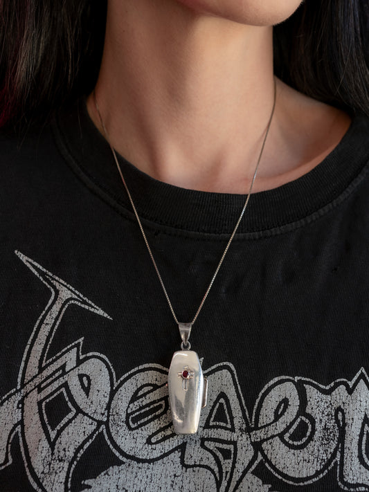 Pied a Terre Silver Coffin functional pillbox pendant featuring natural 3mm ruby at center
