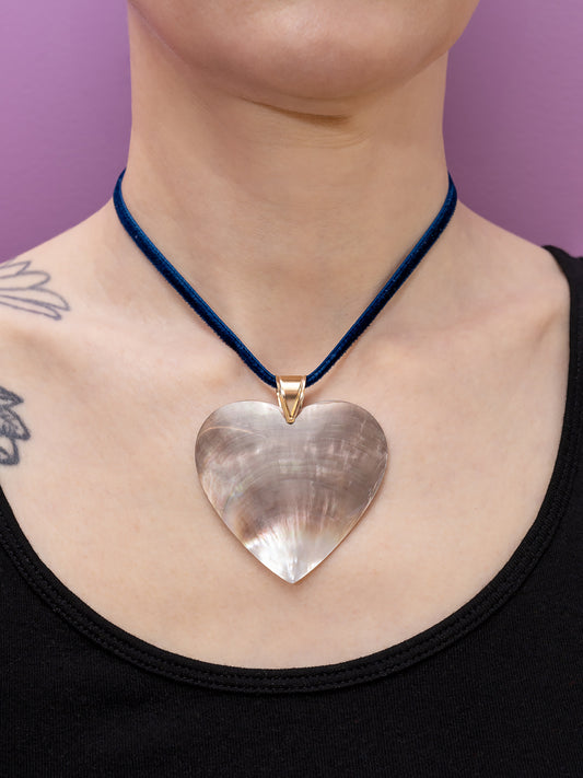 Pied a Terre Hand carved XXL mother of pearl heart pendant with chunky 14k bale