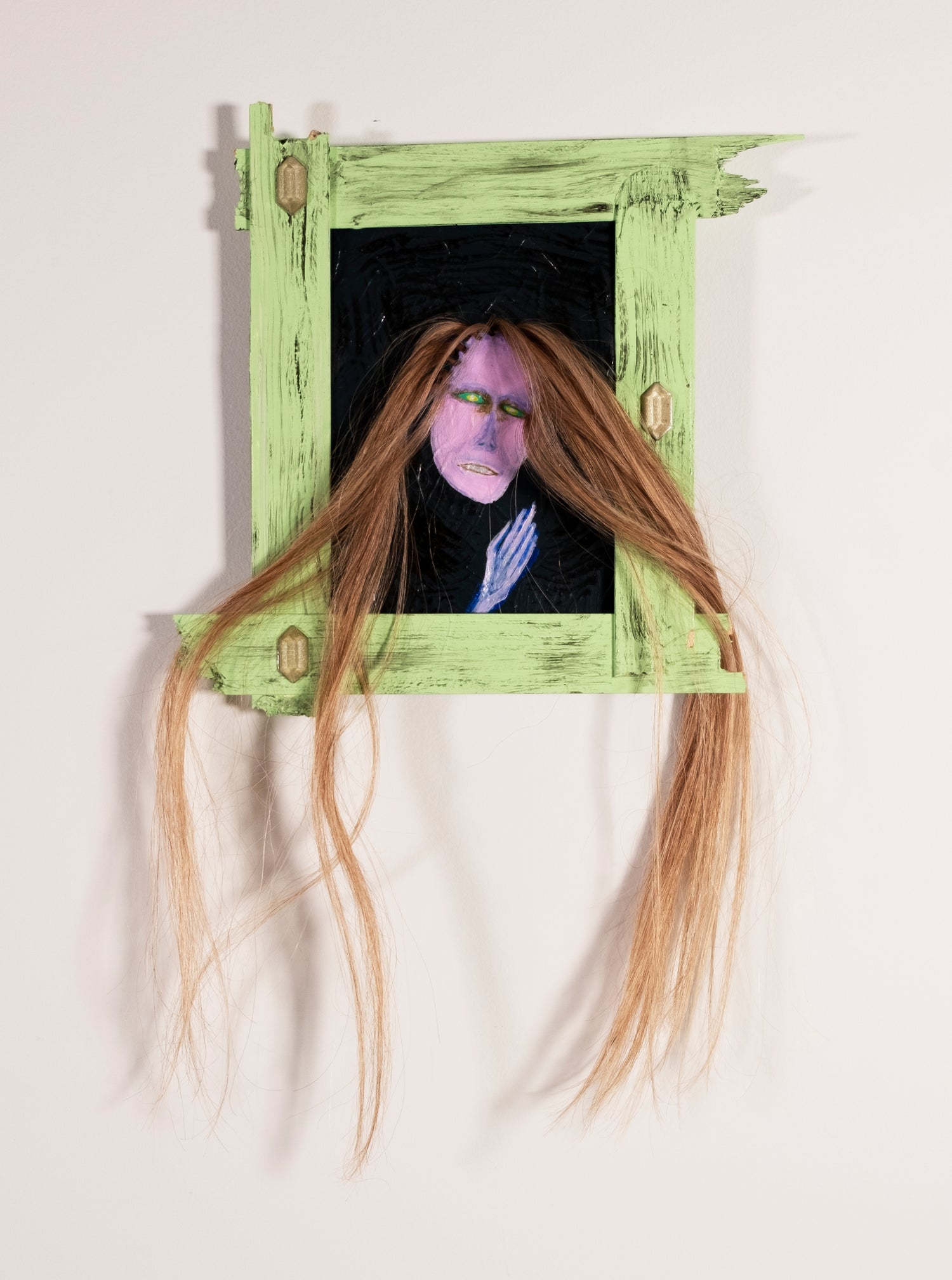 2023, Acrylic, hair extensions, wood frame. 12 × 9 1/2 × 2 in | 30.5 × 24.1 × 5.1 cm. Previously shown as part of Movement of the Triangle.