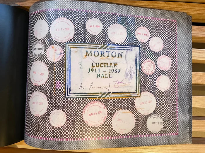 A series of collages based on a rubbing of Lucille Ball’s gravestone. Ball’s remains were moved from LA to upstate NY. Prior to the move, Covert made a series of rubbings from her grave. The collages contain Scott’s signature meditative drawing style combined with hedonistic photos from Scott’s archive.