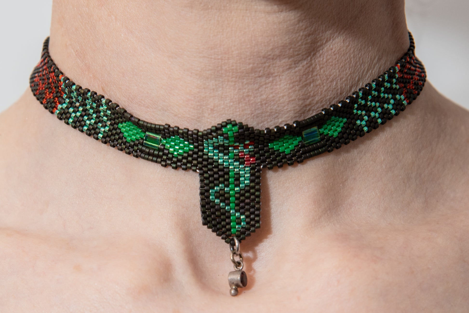 Japanese glass seed beads. Garnet and silver charm. Colored aluminum chain. Sterling silver jump rings and clasp from Karen Hill Tribe in Thailand. Silk thread. By Daniela Mamon
